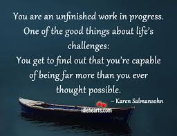 I am a work in progress, still finding the perfect fit, perfect rhythm, perfect light, perfect coodination in all areas of my life. The greatest blessing is that I am my makers canvas, as long as he keeps painting, brush stroke after brush stroke, there is hope yet, for me and the World!!